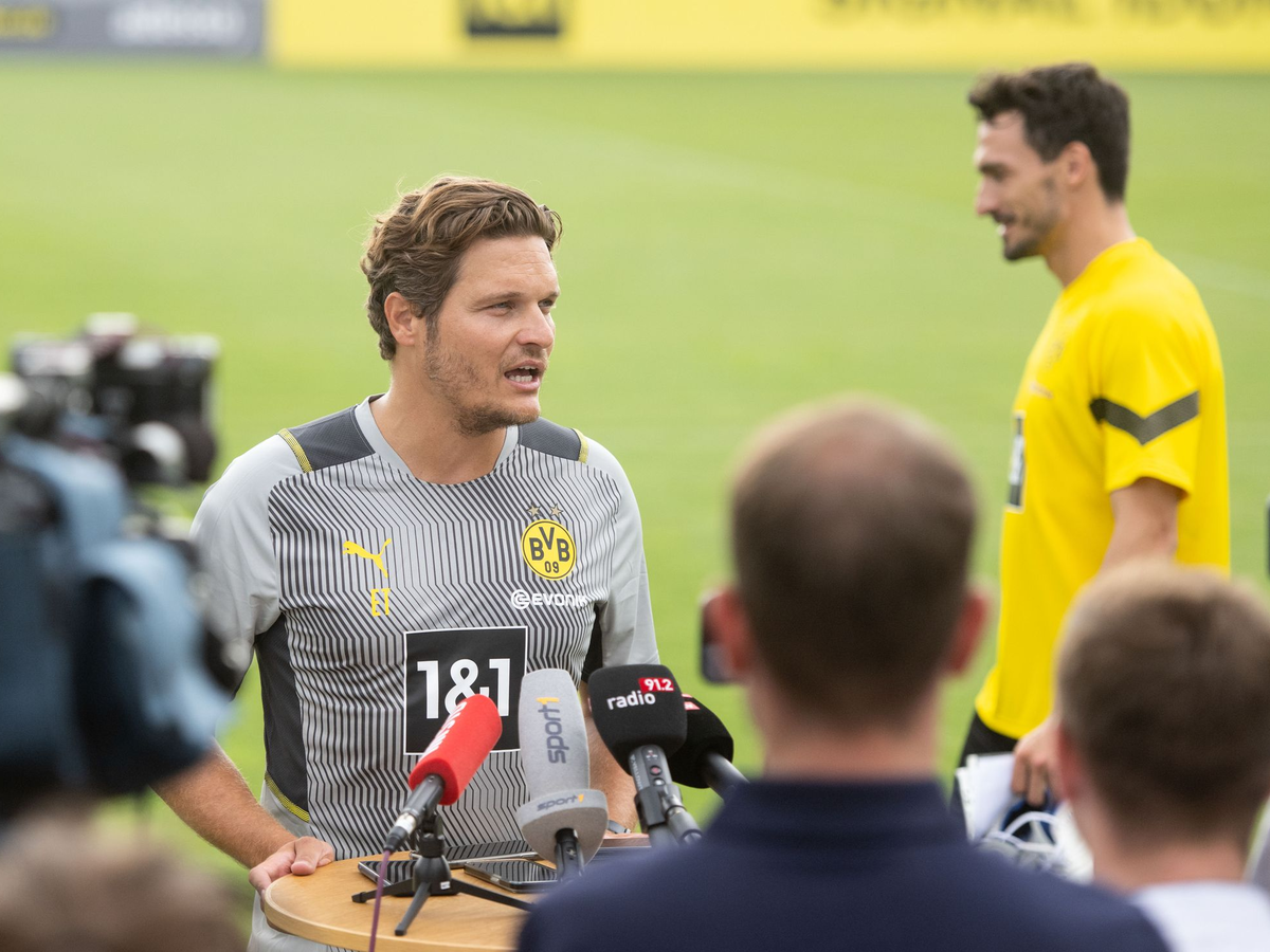Dortmunds Trainer Edin Terzic spricht auf der Pressekonferenz vor dem Rückspiel gegen Atlético Madrid. - Foto: Bernd Thissen/dpa