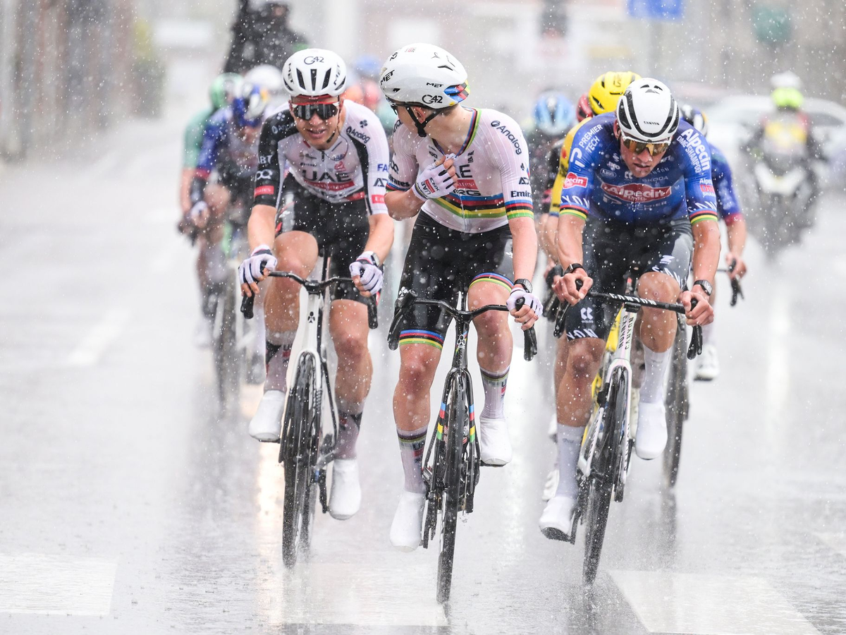 • Pogacar (M) ließ sich auch vom Platzregen nicht stoppen. - Foto: David Pintens/Belga/dpa