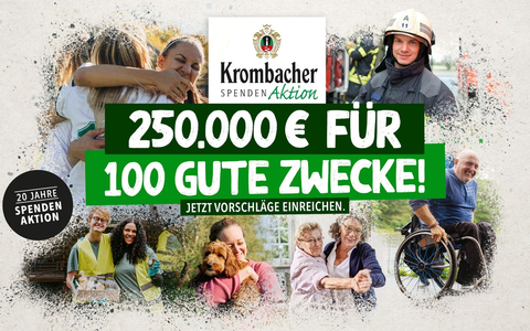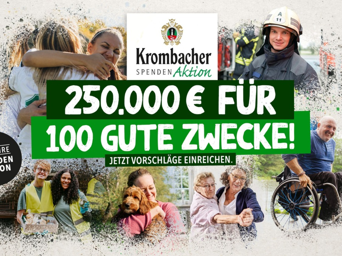 05.12.2023 - 10:01:39 | presseportal.deJe 2.500 Euro für 100 gemeinnützige Institutionen und Projekte stellt die Krombacher Brauerei im Rahmen ihrer jährlichen Spendenaktion für gesellschaftliches Engagement zur Verfügung. "Gesellschaftliches Engagement und das damit vielfach verbundene Ehrenamt sind für unsere Gesellschaft ein essenzieller Anker. Mit unserer jährlichen Spendenaktion möchten wir die zahlreichen gemeinnützigen Einrichtungen und Vereine unbürokratisch unterstützen", so Peter Lemm, Leiter Unternehmenskommunikation der Krombacher Brauerei, zu den Hintergründen der Spendenaktion. Um die verschiedenen Gesichter des gesellschaftlichen Engagements von kleiner Nachbarschaftshilfe bis zu national tätigen Organisationen abzubilden, ruft das Familienunternehmen deutschlandweit die Verbraucher:innen dazu auf, ihren ganz eigenen Spendenfavoriten für eine Spende in Höhe von 2.500 Euro einreichen. Ob Vereinsarbeit, Betreuungsangebot für Senior:innen oder Naturschutzgruppe: Bis zum 3. Januar 2024 können unter www.krombacher.de/spendenvorschlag Vereine, Institutionen und gemeinnützige Einrichtungen, die sich in besonderer Form für das gemeinschaftliche Zusammenleben engagieren, für eine der 100 Spenden vorgeschlagen werden.