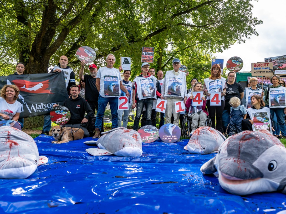 Auf den Tag genau vier Jahre nach der gröĂten dokumentierten Treibjagd auf Delfine, der am 12. September 2021 insgesamt 1.428 WeiĂseitendelfine zum Opfer fielen, versammelten sich im Berliner Botschaftsviertel zahlreiche TierschĂŒtzer:innen, um ihrem Protest gegen die brutalen Massaker Ausdruck zu verleihen. Aufgerufen hatte die Gesellschaft zur Rettung der Delphine e.V., unterstĂŒtzt von der Captain Paul Watson Foundation Germany. In ihren Auftaktreden prangerten beide Organisationen die unhaltbaren ZustĂ€nde der Treibjagden und das immense Leid der MeeressĂ€uger an.