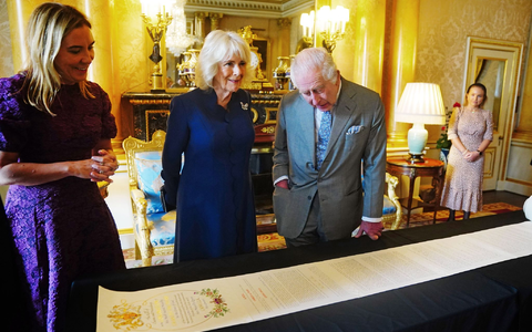 Kalligrafin Stephanie Gill arbeitete 56 Tage in Folge an der sogenannten Krönungsrolle, wie sie dem Paar bei der Übergabe im Buckingham-Palast sagte. Erstmals besteht die üppig dekorierte «coronation roll» aus Papier und nicht aus Tierhaut - und spiegelt damit die Haltung des Königs zum Tierschutz wider.