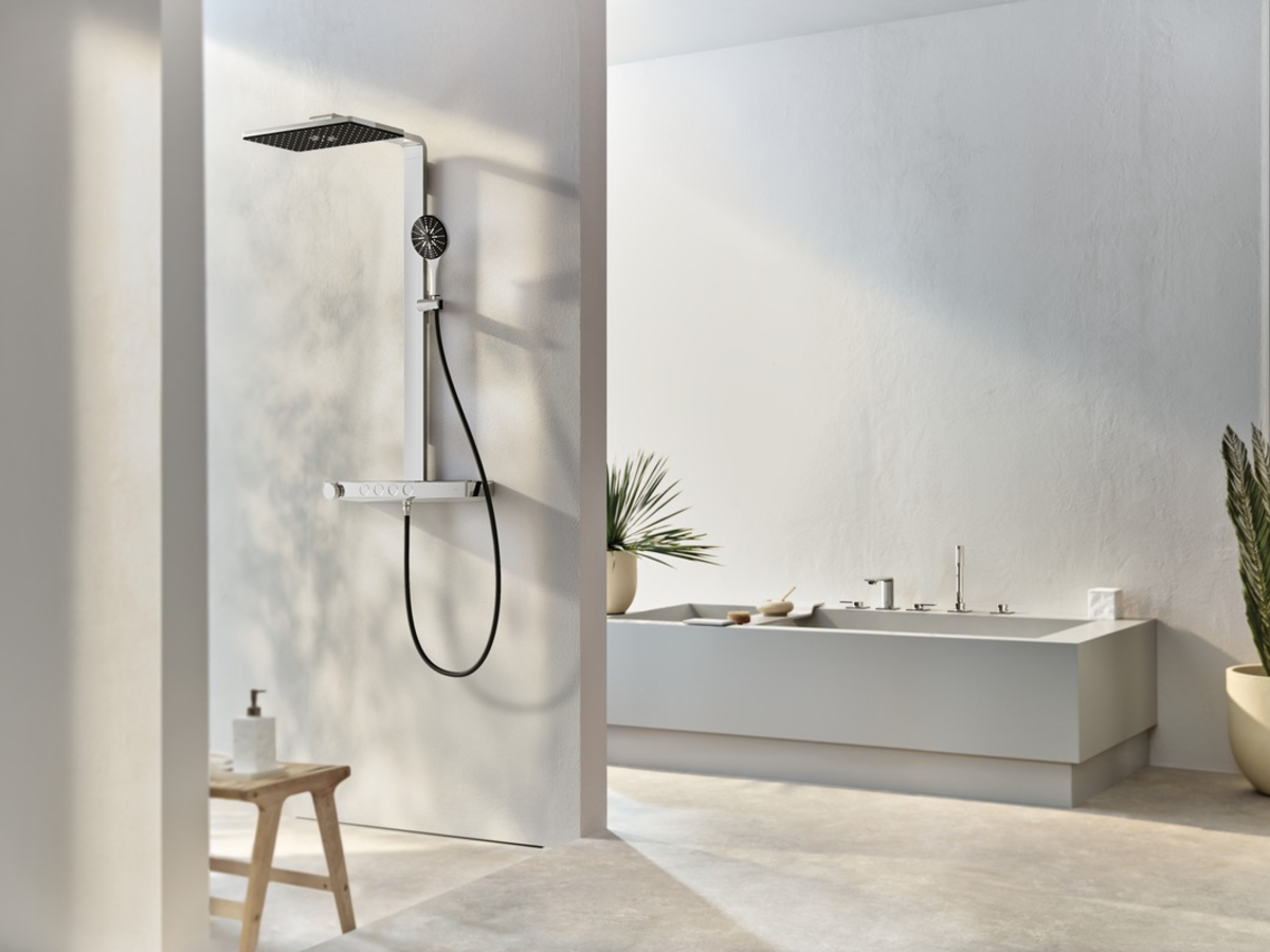 Zudem lässt sich das Duscherlebnis dank verschiedener Strahlarten auf die persönlichen Vorlieben zuschneiden. Die Steuerung der Strahlarten sowie der Kopf- und Handbrausen erfolgt intuitiv über das SmartControl Thermostat, das eine präzise Anpassung von Temperatur und Wassermenge ermöglicht. Mit einem einfachen Knopfdruck kann der Wasserfluss vom sparsamen Eco-Modus auf Full Flow reguliert werden, persönliche Einstellungen lassen sich für zukünftige Anwendungen speichern.
