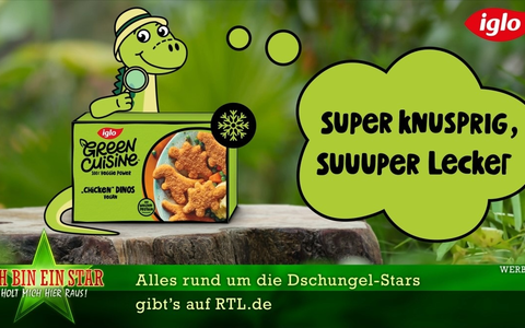 Premiere für das Werbeformat "Dr. Bob empfiehlt": Mit dem sogenannten Empfehlungs-Split wird Dr. Bob erstmals zum temporären Werbegesicht für iglo Green Cuisine. In einem passenden Dschungelcamp-Setting empfiehlt er die veganen Dino-Nuggets gemeinsam mit dem Green Cuisine Dino "Greeny". Der Spot ist mit der ikonischen Stimme von Dr. Bob originalvertont und wird - wie in der Sendung üblich - parallel von einer Off-Stimme ins Deutsche übersetzt. So entsteht das typische "Ich bin ein Star - Holt mich hier raus!"-Ambiente, das den Spot authentisch in das Sendungsumfeld einfügt. Der Werbespot wird über die gesamte Staffel zu sehen sein - darunter auch in der Eröffnungsshow sowie im Finale.