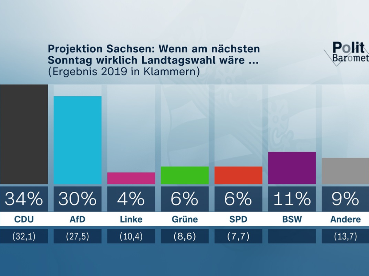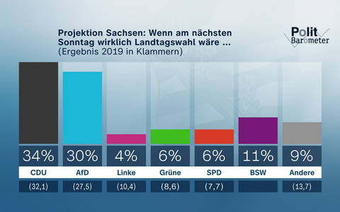 Hier ergäben sich die folgenden Projektionswerte: Die Linke, vor fünf Jahren noch stärkste Partei, käme nur noch auf 15 Prozent. Vorn läge jetzt die AfD mit 30 Prozent, gefolgt von der CDU, die mit 21 Prozent rechnen könnte und dem BSW, das auf 19 Prozent käme. Die SPD könnte 7 Prozent erreichen, die Grünen würden mit 3 Prozent den Einzug in den Landtag verpassen und für die anderen Parteien ergäben sich zusammen 5 Prozent, darunter keine Partei, die mindestens drei Prozent erzielen würde. Knapp reichen würde es damit für eine Koalition aus CDU, BSW und SPD. Daneben hätten auch Bündnisse aus CDU, BSW und Linke sowie aus AfD und CDU oder AfD und BSW eine Mehrheit, diese wurden jedoch von jeweils beteiligten Parteien ausgeschlossen.