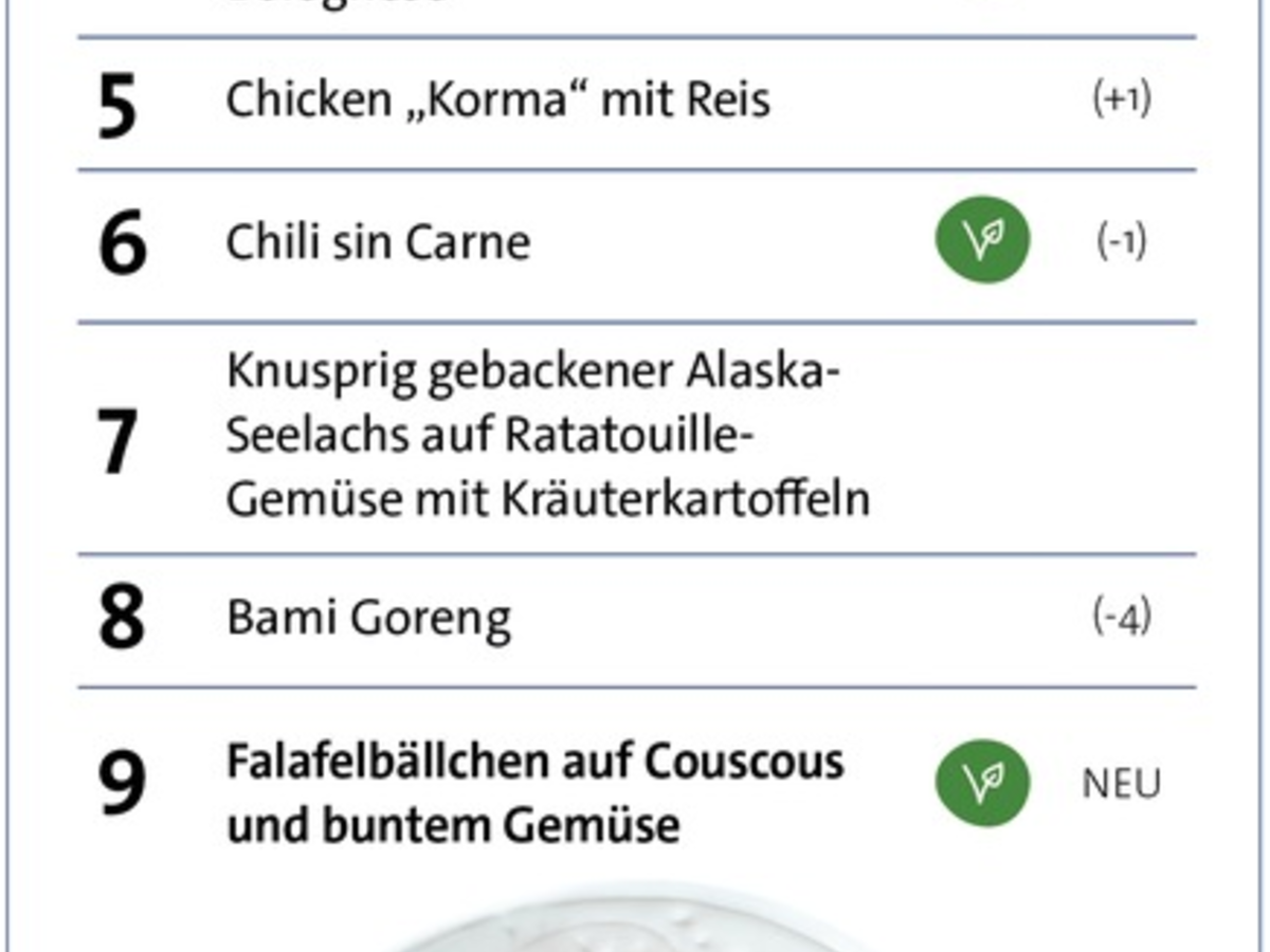Auch moderne und internationale Gerichte sind in der Mittagspause gerne gesehen. Dabei hat es Chicken "Korma" auf Platz 5 geschafft. Aufsteiger des Jahres sind die Falafelbällchen. Ganz neu eingestiegen, belegen sie nun Platz 9. In Summe sind fünf von zehn der beliebtesten Gerichte am Arbeitsplatz vegetarisch.
