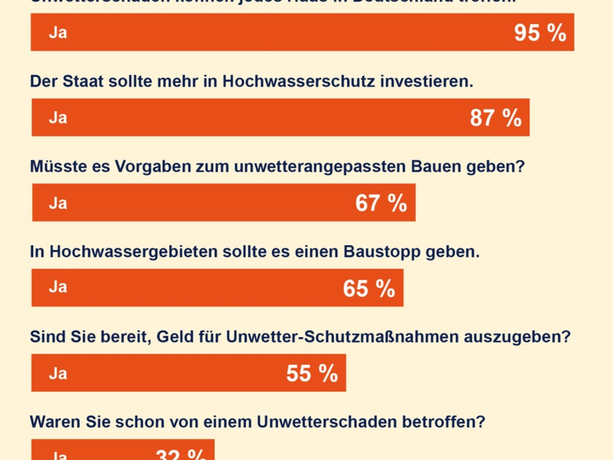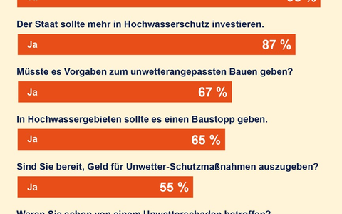 Der Wunsch nach Prävention ist groß - auch das ein eindeutiges Ergebnis der Studie: 87 Prozent der Befragten wünschen sich mehr staatliche Investitionen in Hochwasserschutz. Rund zwei Drittel der Bürgerinnen und Bürger sind für einen konsequenten Baustopp in hochwassergefährdeten Risikogebieten. "Angesichts des Klimawandels muss die Politik dringend handeln. Sie hat eine Fürsorgepflicht für ihre Bürgerinnen und Bürger", betont R+V-Chef Rollinger. "Wenn zu viele Flächen versiegelt werden, marode Deiche weiter verfallen und Neubauten in Überschwemmungsgebieten genehmigt werden, drohen in Zukunft immer häufiger immer größere Schäden."