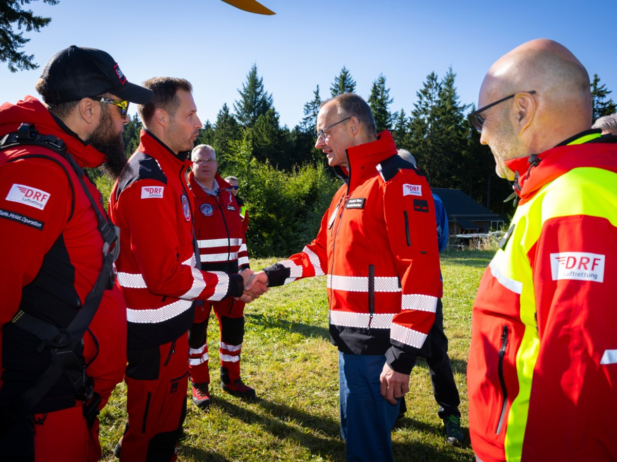 Der Bundeskanzler nahm direkt nach seiner Ankunft an einem der Trainingsdurchläufe teil: Dazu gehörte zunächst ein Erkundungsflug über das Gelände, beim anschließenden zweiten Flug hatte Friedrich Merz die Gelegenheit, den Ablauf einer Windenrettung zu beobachten. Mit einer Seillänge von 90 Metern erlaubt die Winde die notärztliche Versorgung und Rettung von schwer kranken und verletzen Patienten auch in schwierigem oder unzugänglichem Gelände.