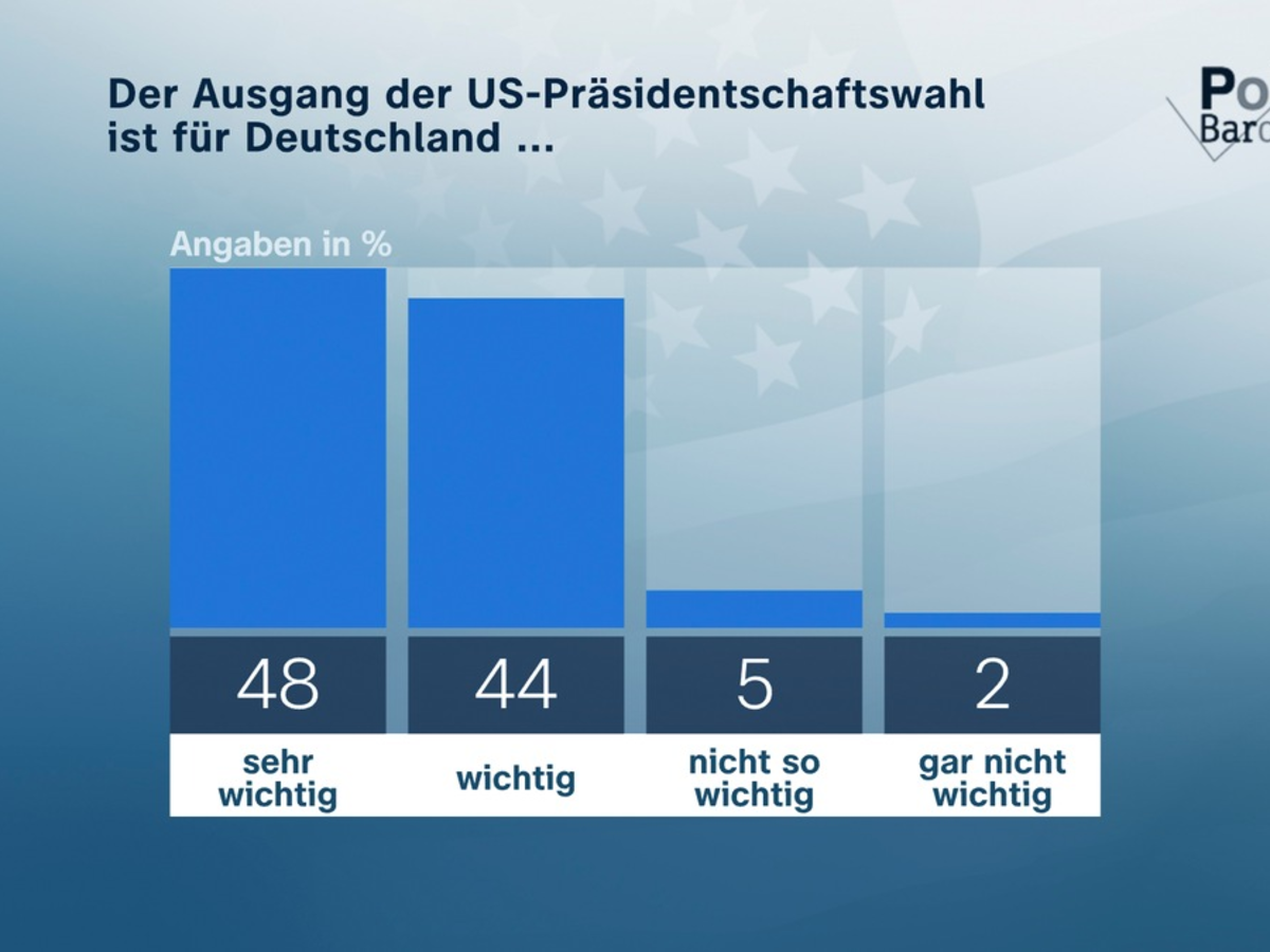 Insgesamt messen die Befragten der US-Wahl eine sehr groĂe Bedeutung bei. 92 Prozent sind der Meinung, dass der Ausgang der Wahl fĂŒr Deutschland sehr wichtig (48 Prozent) oder wichtig (44 Prozent) ist. Nur 7 Prozent halten die Wahl fĂŒr weniger oder ĂŒberhaupt nicht wichtig. Sollte Kamala Harris US-PrĂ€sidentin werden, wĂ€re das fĂŒr 63 Prozent eher gut fĂŒr Deutschland. 6 Prozent meinen, das wĂ€re eher schlecht und 23 Prozent das wĂ€re egal. Bei einem US-PrĂ€sidenten Trump gehen 81 Prozent davon aus, dass das eher schlecht fĂŒr Deutschland wĂ€re und nur 8 Prozent sĂ€hen darin einen Vorteil (egal: 7 Prozent).