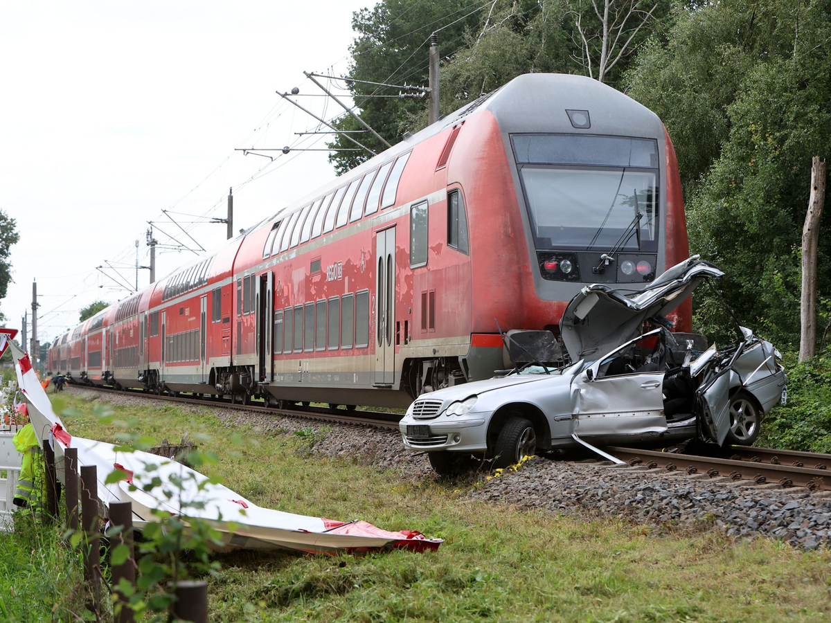 29.07.2025 - 15:54:59 | dpa.deVöllig demoliert steht das silberne Auto nach dem Zusammenstoß mit einem Regionalexpress auf den Schienen im niedersächsischen Bad Zwischenbahn. Die beiden Menschen in dem Wagen, ein 13 Jahre alter Junge und ein 49 Jahre alter Mann, starben bei der Kollision, wie ein Polizeisprecher sagte. Der Zug hatte das Auto an einem Bahnübergang erfasst und trotz Bremsung mehrere Hundert Meter vor sich hergeschoben. Warum es zu dem folgenschweren Zusammenstoß kam, ermittelt nun die Polizei.