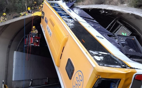 Bus nach Unfall fast in der Senkrechten: 31 Verletzte