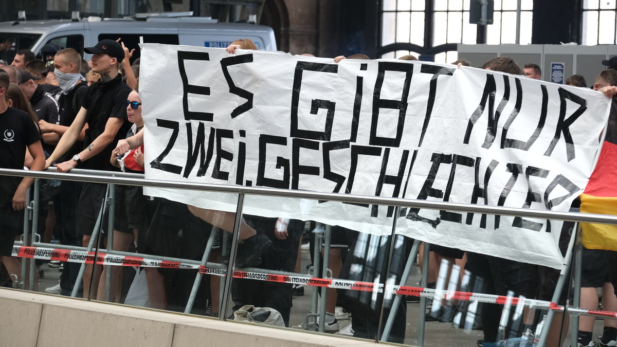 Wie die Polizei auf X berichtete, zeigten die Teilnehmer der rechtsextremen Kundgebung schon bei der Ankunft «ein versammlungstypisches und teilweise aggressives bzw. militantes Verhalten». Sie wurden einer Identitätsfeststellung unterzogen und nach gefährlichen Gegenständen durchsucht.