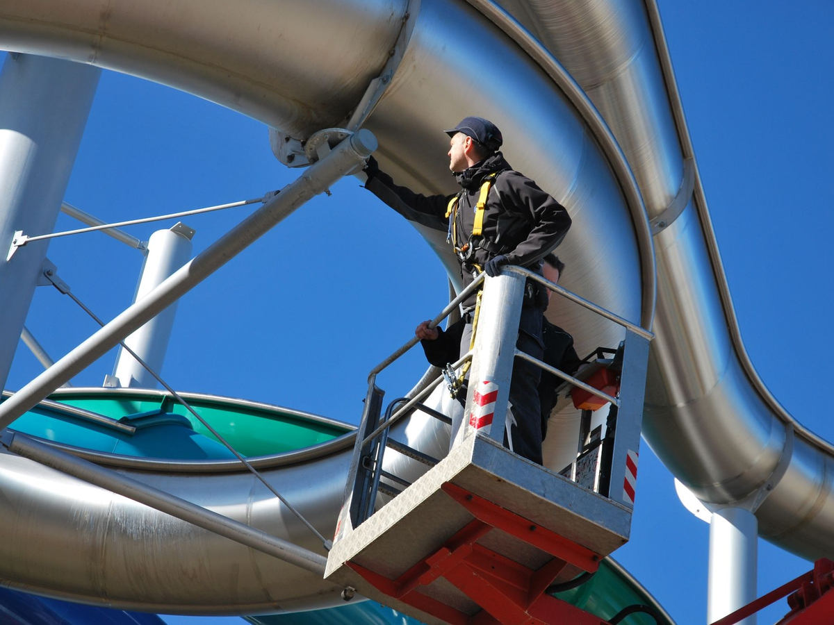 Ferdinand Ziegler vom TÜV Süd prüft eine Wasserrutsche auf dem Außengelände der Therme Erding.