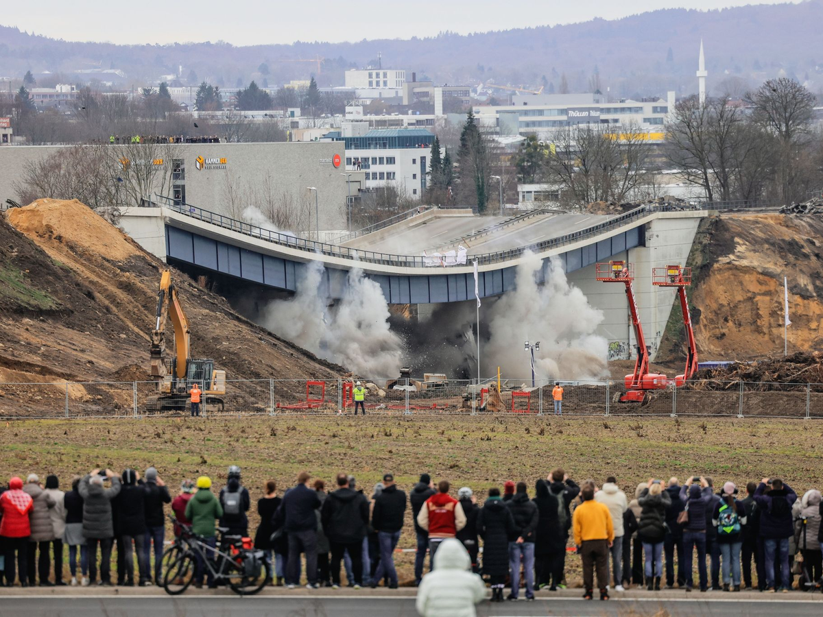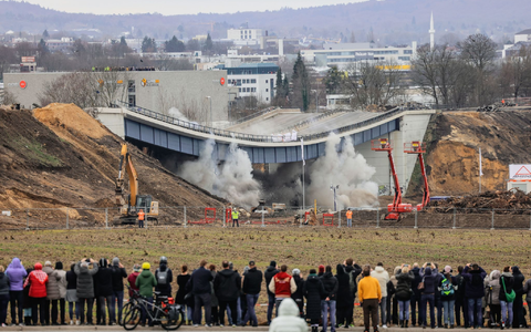 30.01.2024 - 15:13:00 | dpa.deMit einem kräftigen Rums ist bei Aachen eine marode Autobahnbrücke gesprengt worden. Die letzte Sekunde der sogenannten Haarbachtalbrücke war am Dienstagmittag gekommen - ein Sprengmeister ließ sie in sich zusammenfallen. Dem geschundenen Bauwerk aus den Fünfzigern wurden dazu mit mehreren Detonationen die mit Beton gefüllten Stahlstützen weggerissen. Innerhalb von 75 Hundertstelsekunden hätten 240 Sprengladungen gezündet, berichtete die Autobahn GmbH des Bundes. Danach ging alles ganz schnell.