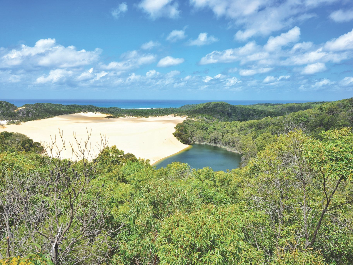 Mit einer Länge von 122 Kilometern ist K'gari die größte Sandinsel der Erde. Der Name steht für türkisfarbene Seen wie den Lake McKenzie, abenteuerliche Offroad-Touren entlang des 75 Mile Beach und himmelhohe Baumriesen im Valley of the Giants. Hunderttausende Besucher kommen jedes Jahr für einen Tagestrip oder zum Campen.
