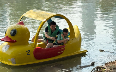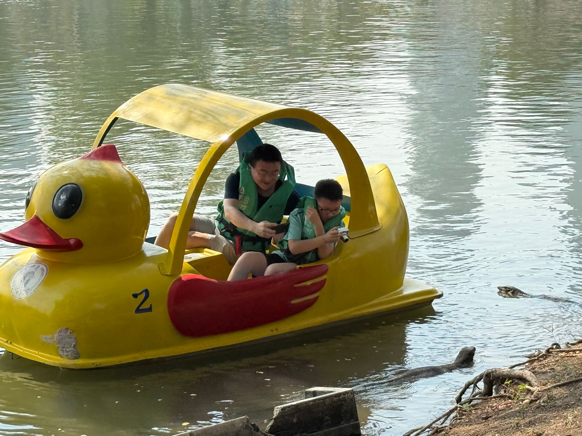 Unbeeindruckt vom Schrecken des chinesischen Urlaubers marschiert er auf einen See zu, der mit gelben Tretbooten gesprenkelt ist - und gleitet geschmeidig ins Wasser. Sofort treten Touristen in die Pedale und nähern sich neugierig, während das Tier elegant mit seinem seitlich abgeflachten Schwanz durchs trübe Grün rudert.