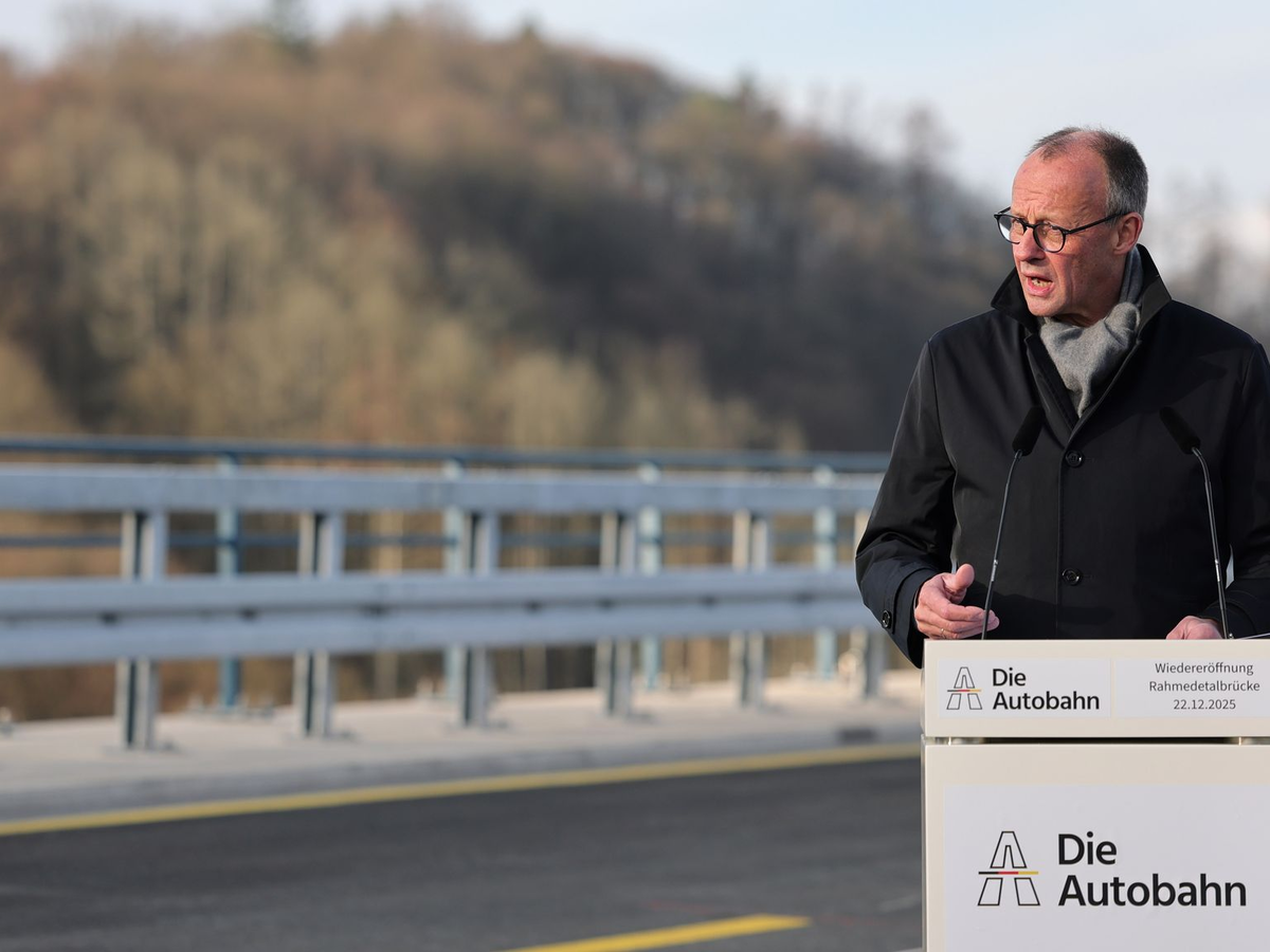 Mehr als vier Jahre nach der plötzlichen Sperrung ist die Rahmedetalbrücke auf der A45 im Sauerland wieder offen: Bundeskanzler Friedrich Merz hat am Montag einen ersten Teil-Neubau an der wichtigen Nord-Süd-Verbindung freigegeben. Zusammen mit Bundesverkehrsminister Patrick Schnieder (beide CDU) schnitt Merz ein symbolisches Band durch. Kurz darauf sollte der Verkehr auf der für 170 Millionen Euro neu gebauten Brücke nach der Freigabe der Polizei wieder rollen.