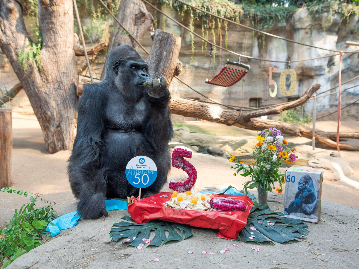 Überraschung für den Gorilla Assumbo im Rostocker Zoo: Zum 50. Geburtstag erhielt er am Samstag von den Tierpflegern eine Geburtstagstorte. Auch das Gehege war bunt geschmückt. «50 Jahre ist für einen Gorillamann ein sehr beachtliches Alter», sagte die Zoodirektorin Antje Angeli. In der Natur, ohne medizinische Betreuung und spezielle Nahrung, würden Gorillas nur etwa 35 bis 40 Jahre alt. «Wir sind sehr froh, dass es Assumbo gesundheitlich gut geht. Er wiegt momentan stolze 165 Kilogramm und frisst sehr gut.»