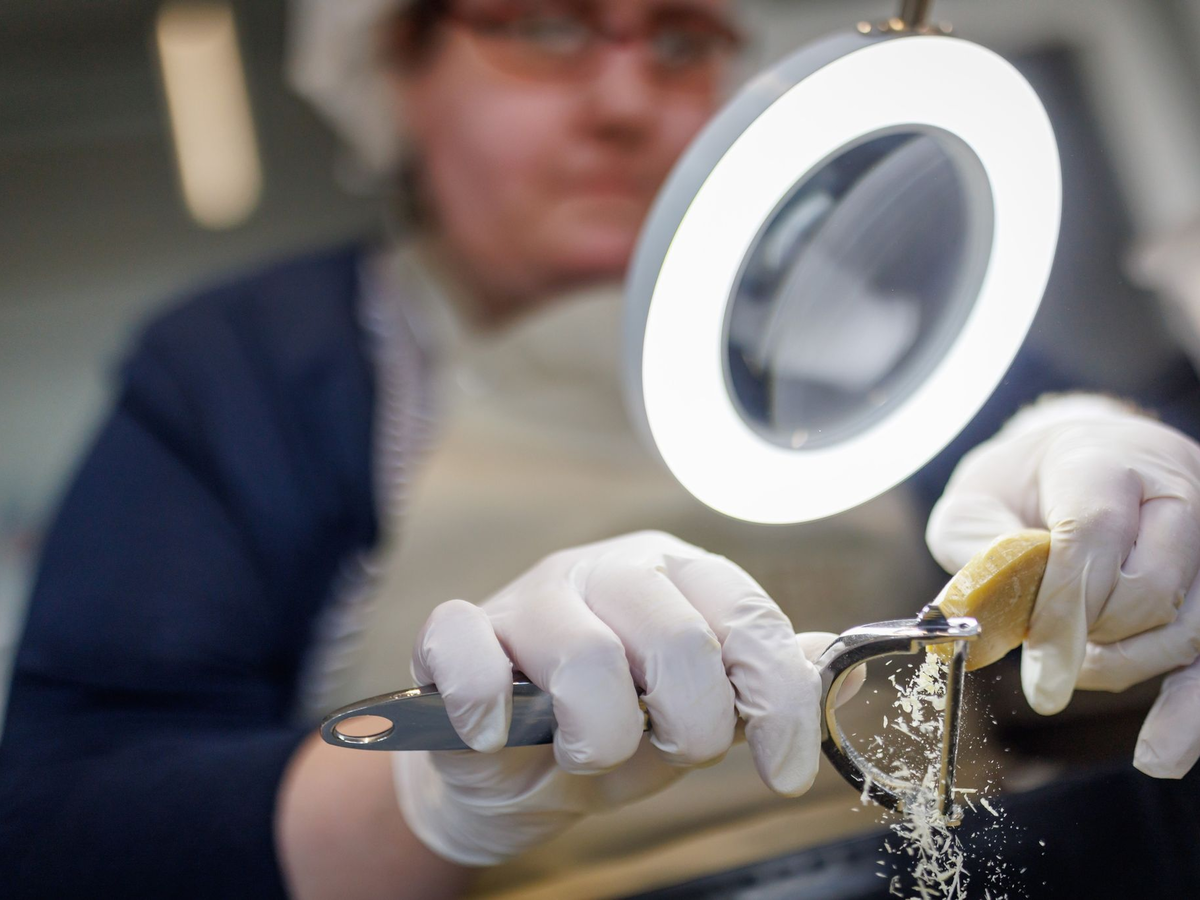 Besonders aufwendig ist es, die obersten Schichten der Seifen abzutragen. Neben dem Arbeitsplatz von Kristian Steko stapeln sich grüne Seifen in einer Kiste, unter seinem Hobel türmen sich die Seifen-Späne. Die auf diese Weise gereinigten Seifen werden in einem Hochleistungsmixer zu Mehl zermahlen. Vermischt mit destilliertem Wasser wird dieses erst zu einer an Nudeln erinnernden Masse gepresst und dann zu neuen Seifen geformt, mal in Grün, mal in Weiß oder einer anderen Farbe - abhängig von der Ausgangsseife.
