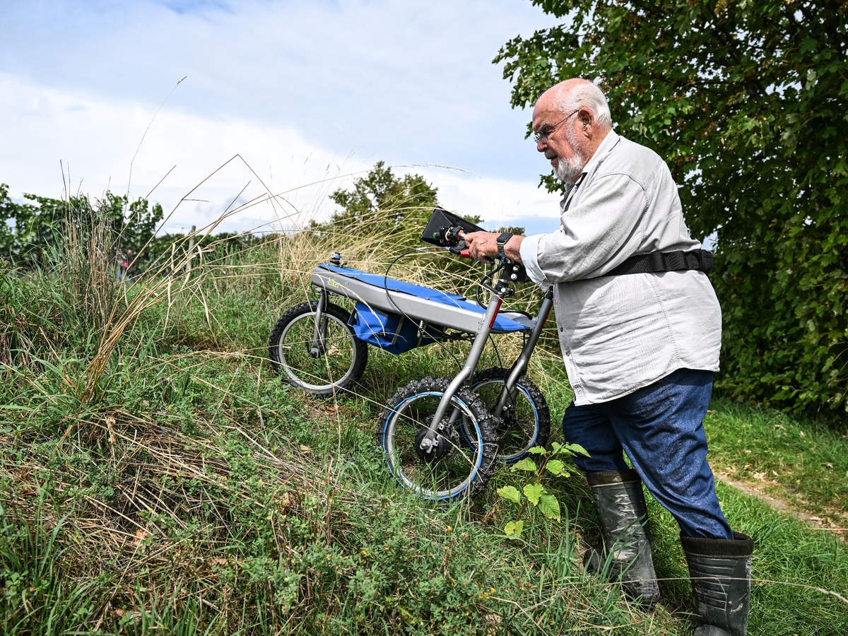 Drei Jahre habe er getüftelt, gerechnet und schließlich eine Art Wanderhilfe mit Elektroantrieb erfunden. «Es musste eine Kombination zwischen Mountainbike und Rollator sein», sagt der Ingenieur. Heute ist er mit seinem «E-Hiker» jenseits der Straßen unterwegs - einem stabilen Rollator mit allerlei speziellen Details.