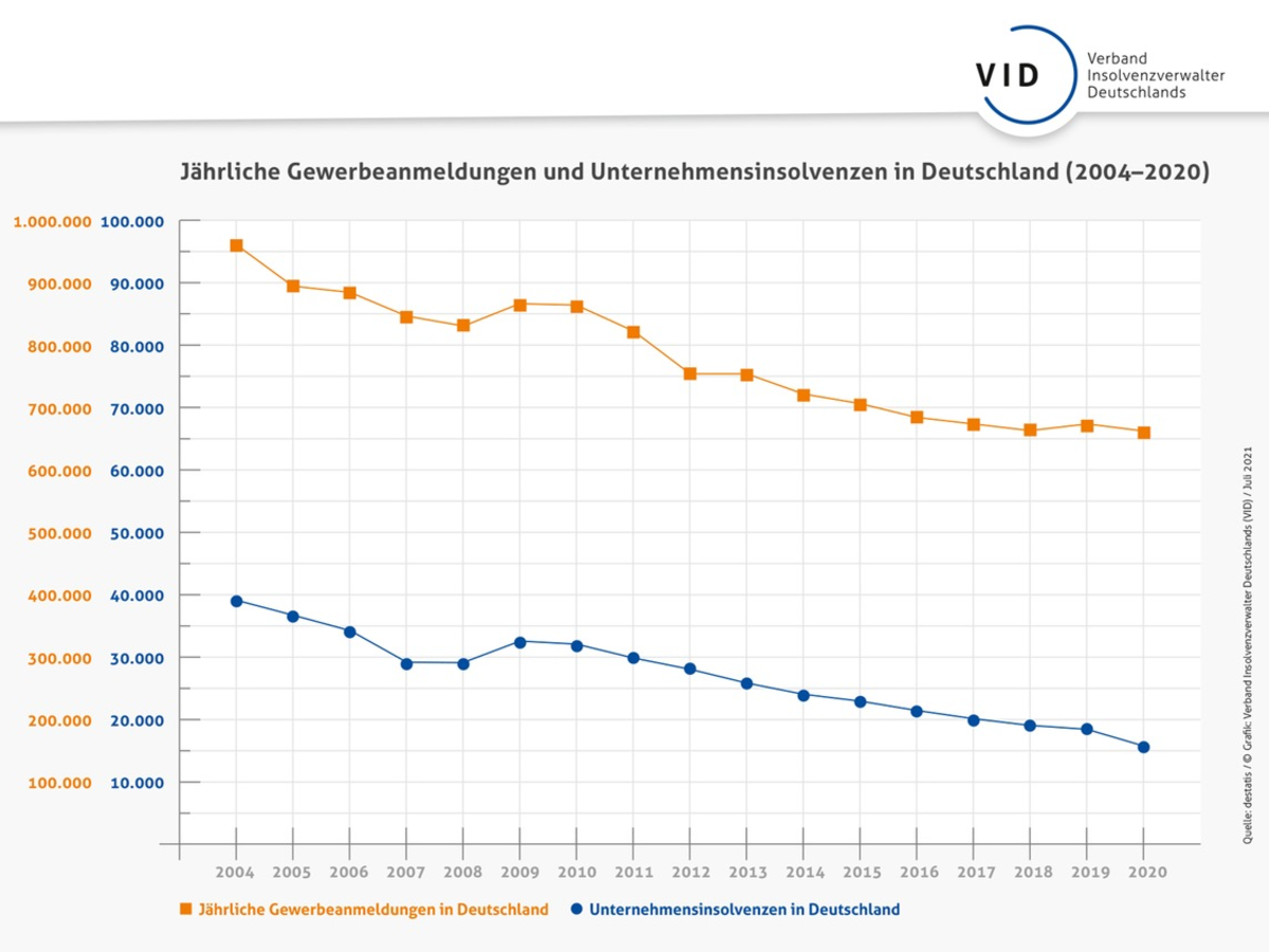 Der aktuelle Anstieg der Insolvenzzahlen ist vor allem eine Normalisierung des Insolvenzgeschehens nach dem Auslaufen der staatlichen Hilfen. "Einen Anstieg, wie wir ihn Mitte der Nullerjahre gesehen haben, mit über 30.000 Insolvenzen pro Jahr, werden wir zukünftig nicht mehr sehen", erklärt Dr. Christoph Niering, Insolvenzverwalter und Vorsitzender des Berufsverbandes der Insolvenzverwalter und Sachwalter Deutschlands (VID). Das hat strukturelle Gründe: Das seit vielen Jahren rückläufige Gründungsverhalten in Deutschland wirkt sich direkt auf das Insolvenzgeschehen aus. Gerade in den ersten fünf Jahren nach Gründung besteht für Unternehmen die höchste Insolvenzgefahr. "Ein Warnsignal für die Wirtschaftspolitik. Die Unternehmenslandschaft erneuert sich schon lange nicht mehr ausreichend. Kommen nicht genug neue Unternehmen nach, sinkt das Innovationspotential. Das für Gründer beschwerliche Vorschriftendickicht trägt noch dazu bei", so Niering.