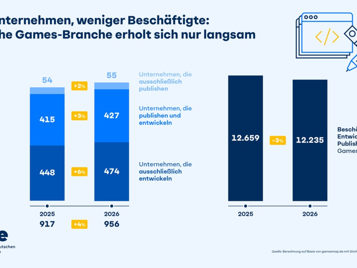 Bei den Unternehmen wächst vor allem die Zahl der reinen Entwicklerstudios: Sie steigt um 6 Prozent auf 474 Unternehmen. Die Zahl der Unternehmen, die sowohl entwickeln als auch publishen, legt um 3 Prozent auf 427 zu. Die Zahl der reinen Publisher wächst um 2 Prozent auf 55 Unternehmen. Diese Zunahme bedeutet eine Trendumkehr: Nach der Einführung der bundesweiten Games-Förderung 2020 kam es zunächst zu einer Gründungswelle: Innerhalb von vier Jahren stieg die Anzahl der Games-Unternehmen um über 50 Prozent. Die Dynamik nahm kontinuierlich ab, bis es 2025 sogar zu einem Rückgang von 4 Prozent kam. Dieser Trend kehrt sich nun wieder um, was trotz der globalen Konsolidierung durch verlässlichere Förderbedingungen unter der neuen Bundesregierung und das erstmals durchgeführte "Press Start"-Gründungsstipendium der Bundesregierung erreicht werden konnte. Unterstützt durch das Stipendien- und Ausbildungsprogramm hatten sich 75 Games-Studios in Deutschland neu gegründet.