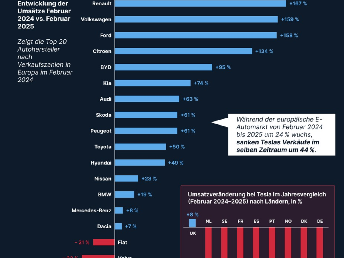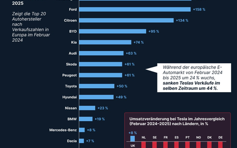WÀhrend Tesla in vielen europÀischen LÀndern zwischen 15 und 20 Prozentpunkten Marktanteile zu Beginn des Jahres verloren hat, verzeichnen Hersteller wie Volkswagen, Renault, Ford, Citroën, BYD und Kia ein krÀftiges Absatzplus - teils mehr als eine Verdoppelung der Verkaufszahlen im Februar.