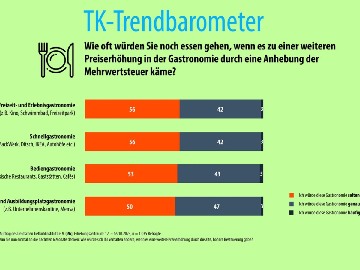 Das dti hat im aktuellen TK-Trendbarometer Verbraucher:innen zu ihren aktuellen Gewohnheiten und persönlichen Einschätzungen beim Außer-Haus-Verzehr befragt. Ergebnis: Knapp die Hälfte der Befragten besuchte die Gastronomie in den letzten sechs Monaten seltener als davor. Die Hauptgründe dafür sind zu hohe Preise und generell die Absicht zu sparen.