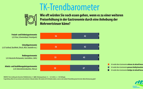"Dieses Ergebnis macht deutlich, dass die Besteuerung von Speisen in Gastronomie und Hotellerie mit der von Lebensmitteln aus dem Supermarkt unbedingt gleichgestellt werden muss", appelliert dti-Geschäftsführerin Sabine Eichner an die Ampel-Koalition. "Eine Steuererhöhung wäre gerade in der aktuellen Inflationsphase ein echter Preisschock, Gift für das Konsumklima - und würde sich sehr negativ auf die Arbeits- und Ausbildungsplatz- sowie die Bediengastronomie auswirken. Für den reduzierten Mehrwertsteuersatz gibt es gute Gründe! Die Bundesregierung darf die Gastronomie daher nicht in eine existenzielle Notlage bringen."