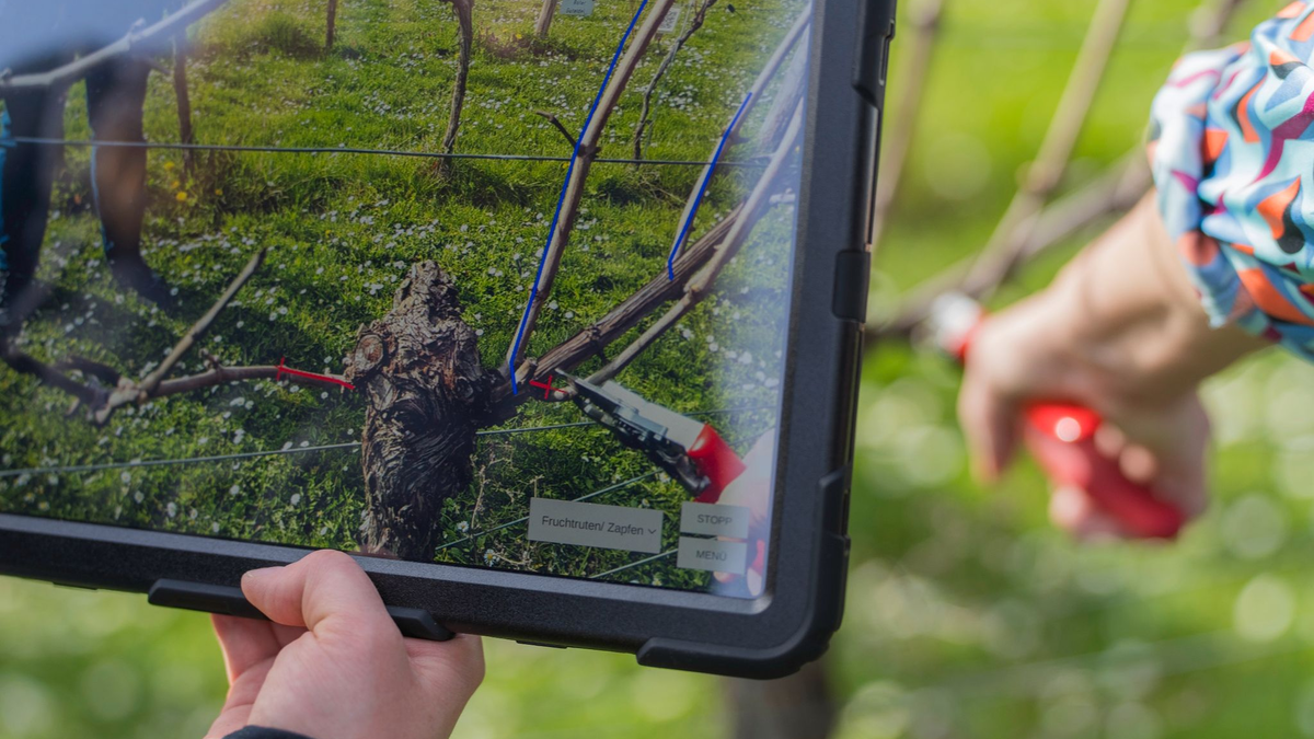 Das Display eines Tablets zeigt die Punkte, an dem die Rebe beschnitten werden soll.