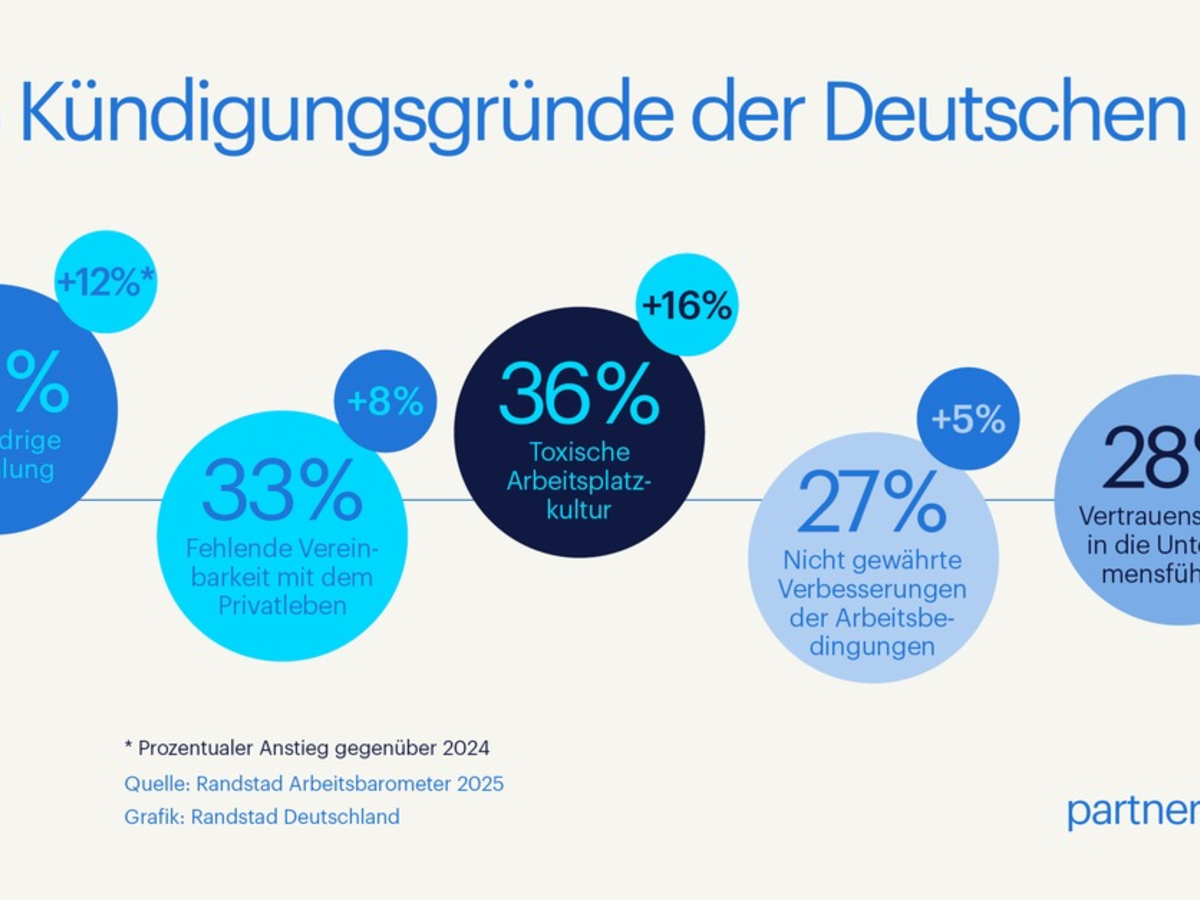 Mehr als jede:r Dritte hat bereits den Job gewechselt, weil die Bezahlung nicht stimmte. Doch finanzielle Aspekte sind längst nicht mehr der einzige Grund, warum deutsche Beschäftigte kündigen. Das aktuelle Randstad Arbeitsbarometer 2025 zeigt: Toxische Unternehmenskultur, mangelndes Vertrauen in die Führungsebene und fehlende Flexibilität treiben den Jobwechsel stärker voran als im Vorjahr.
