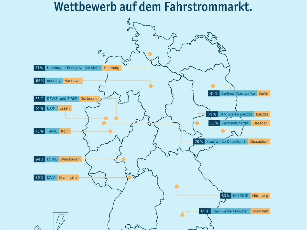 Datengrundlage fĂŒr die Monopolanalyse ist das LadesĂ€ulenregister der Bundesnetzagentur mit Stand vom 1. Dezember 2025. FĂŒr die Auswertung wurden ausschlieĂlich gebĂŒhrenpflichtige NormallladesĂ€ulen berĂŒcksichtigt, die fĂŒr alle Fahrstromkund*innen zugĂ€nglich sind.