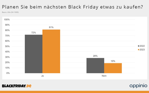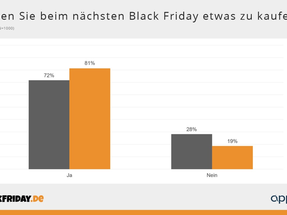 Auf die Frage "Planen Sie beim nÀchsten Black Friday etwas zu kaufen?" antworteten in diesem Jahr rekordverdÀchtige 81 Prozent der Befragten mit "Ja". Im Vergleich zum Vorjahr entspricht dies einer Steigerung von 12,5 Prozent. Nie zuvor plante ein so hoher Teil der Befragten am Black Friday auf SchnÀppchenjagd zu gehen.