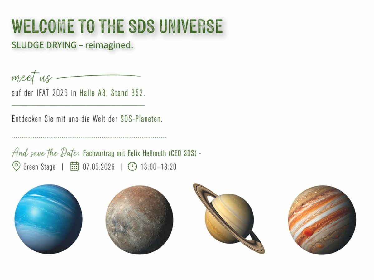 Mit den Anlagen SDS Jupiter, SDS Saturn, SDS Neptun und SDS Merkur führt das Unternehmen eine einheitliche Namenssystematik ein, die sich an den Größenverhältnissen unseres Sonnensystems orientiert. Dadurch entsteht eine intuitive und praxisnahe Zuordnung der jeweiligen Leistungsstufen - von kompakten Anlagen bis hin zu besonders leistungsstarken Systemen, die alle für anspruchsvolle Anwendungen in der Klärschlammbehandlung und industriellen Schlammtrocknung einsetzbar sind.
