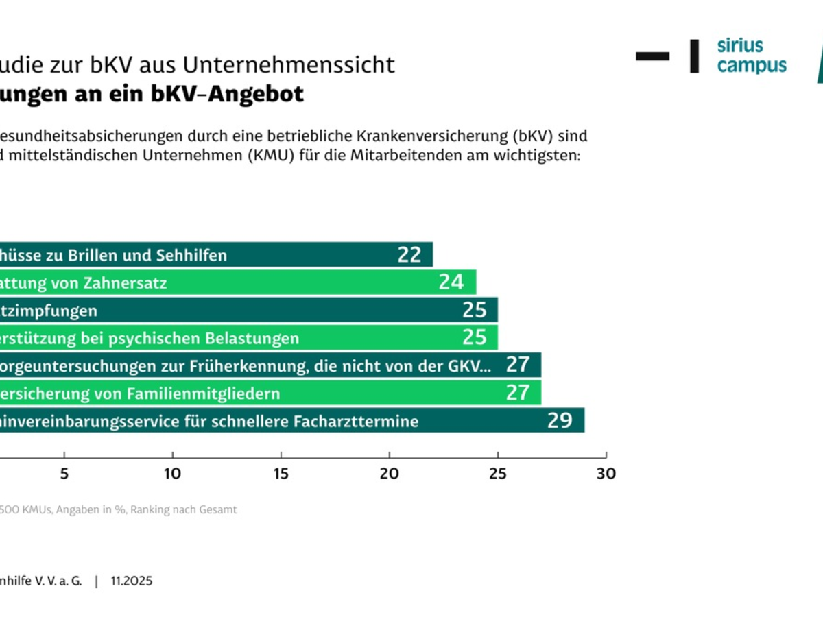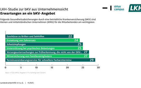 "An der 'LKH-Studie zur bKV aus Unternehmersicht' nahmen 500 Versicherungsentscheidende von KMUs teil. Die repräsentative Stichprobe bildet die Gesamtheit der 3,2 Mio. KMUs entlang der tätigen Personen in den Unternehmen ab", so Dr. Oliver Gaedeke, Geschäftsführer der Sirius Campus GmbH. Laut Umfrage plant fast jedes zehnte befragte Unternehmen (9 Prozent) die Einführung der bKV in den kommenden 12 Monaten. Weitere 24 Prozent der Unternehmen sind offen und interessiert, sich mit der bKV weitergehend auseinanderzusetzen. Bei den gewünschten Leistungen haben die Personalverantwortlichen klare Vorstellungen. So wünscht sich jeder Dritte Befragte (29 Prozent) einen Terminvereinbarungsservice bei Fachärzten für seine Mitarbeitenden, ebenso stehen Vorsorgeuntersuchungen (27 Prozent) im Fokus. Damit soll zum einen die Gesundheitsversorgung im Krankheitsfall und auch die Vorsorge verbessert werden.