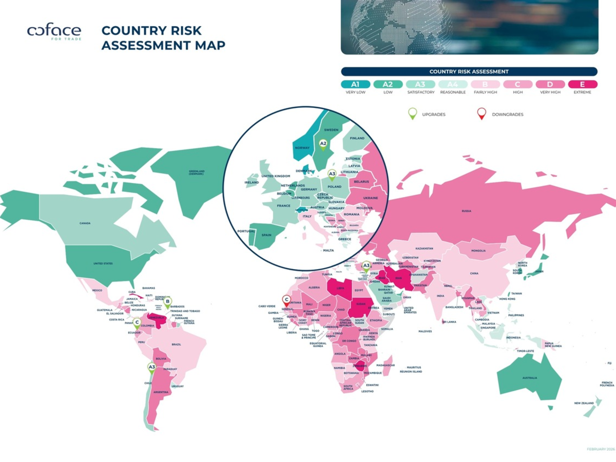 Im Bereich der LĂ€nderrisiken hat Coface insgesamt sieben Anpassungen vorgenommen, darunter sechs Aufwertungen. Das LĂ€nderrisiko beschreibt das allgemeine Umfeld eines Landes, um lokale Kreditrisiken zu bewerten und einordnen zu können. Chile wurde aufgrund deutlich steigender Investitionen im Kupfer- und Energiesektor sowie eines stabilen institutionellen Rahmens von A4 auf A3 hochgestuft. Polen verbessert sich ebenfalls von A4 auf A3, getragen durch ein hohes Investitionstempo infolge umfangreicher EU-Mittel und eine anhaltend robuste Konsumnachfrage. Schweden wird von A3 auf A2 angehoben, da eine widerstandsfĂ€hige private Nachfrage, ein sich erholender Arbeitsmarkt und eine expansive Fiskalpolitik das Land stabilisieren. Auch Zypern wurde angesichts eines Rekordjahres im Tourismus und hoher Investitionsimpulse aus europĂ€ischen Förderprogrammen von A4 auf A3 hochgestuft. Barbados erreichte eine Verbesserung des LĂ€nderrisikos von C auf B, nachdem eine konsequente fiskalische Konsolidierung und sinkende Staatsverschuldung das Vertrauen in die wirtschaftliche Entwicklung gestĂ€rkt hatten. Ecuador wurde von D auf C angehoben, nachdem das Land sich nach der schweren Energiekrise 2024 stabilisiert und umfassende Reformen eingeleitet hat, die vom Internationalen WĂ€hrungsfonds (IWF) unterstĂŒtzt werden.