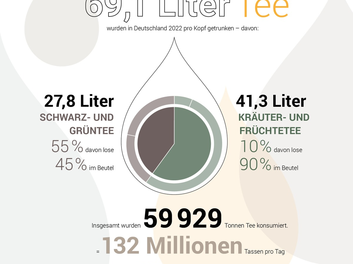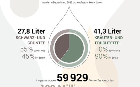 Besonders interessant ist auch der Teekonsum der Deutschen. Hier liefert der Teereport Zahlen, die zeigen, wie viel Liter Tee in Deutschland pro Kopf getrunken werden. 69,1 Liter waren es im Jahr 2022, landesweit betrug der Gesamtkonsum 59.929 Tonnen - das entspricht 132 Millionen Tassen am Tag oder fast 5,5 Millionen Tassen pro Stunde. Auch bezüglich der bevorzugten Teesorten gibt der Report Insights: 27,8 der insgesamt 69,1 Liter im Jahr 2022 waren Schwarz- und Grüntee. 41,3 Liter entfielen auf Kräuter- und Früchtetees, wobei Ingwer die beliebteste Sorte war.