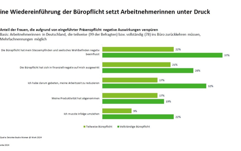 Von den 500 Studienteilnehmerinnen in Deutschland berichtet fast jede Sechste, ihr Arbeitgeber habe sie dazu verpflichtet, an sämtlichen ihrer Arbeitstage zurück ins Büro zu kommen; jede Fünfte erhielt solch eine Verpflichtung zumindest für einen Teil der Arbeitstage. Unter den Frauen mit kompletter Büropflicht berichten 37 Prozent, diese Verpflichtung habe ihr Stressempfinden oder ihr seelisches Wohlempfinden negativ beeinflusst. In der zweiten Gruppe mit teilweiser Büropflicht geben dies 22 Prozent an. Weltweit liegen die entsprechenden Anteile etwas niedriger, jeweils bei 26 und bei 18 Prozent.