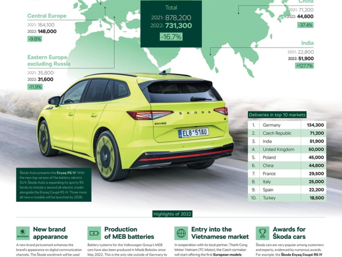 Die größten absoluten Zuwächse verzeichnet Škoda in Deutschland (140.000 Fahrzeuge; +24.600), in der Türkei (30.100 Fahrzeuge; +5.700), in Großbritannien (58.300 Fahrzeuge; +5.200), in Polen (43.900 Fahrzeuge; +4.600) und Frankreich (31.600 Fahrzeuge; +4.300). Auch in der Mittelmeerregion steigen die Zahlen deutlich, etwa in Israel (15.900 Fahrzeuge; +3.100), Italien (27.900 Fahrzeuge; +2.400) und Spanien (24.600 Fahrzeuge; +2.400).