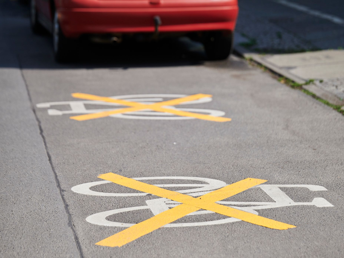 Wo mehr Platz und Sicherheit für den Radverkehr geplant waren, stehen nun weiter Autos: Auf der Ollenhauer Straße im Berliner Bezirk Reinickendorf zeigte sich zuletzt ein Aspekt der neuen Hauptstadt-Verkehrspolitik derzeit besonders bildhaft. Die Fahrradsymbole auf dem bereits eingerichteten Radstreifen wurden hastig mit gelben Streifen überklebt.
