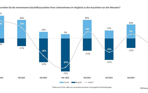 Trotz der negativen GeschĂ€ftsaussichten fallen die Unternehmensplanungen fĂŒr die kommenden zwölf Monate gemĂ€Ăigter aus. Die Unternehmen erwarten steigende UmsĂ€tze (Indexwert: 22%). Der Anstieg fĂ€llt damit etwas moderater aus als noch im FrĂŒhjahr (Indexwert: 27%). Gleichzeitig rechnen die CFOs mit sinkenden operativen Margen (Indexwert: -10%, FrĂŒhjahr: -2%).