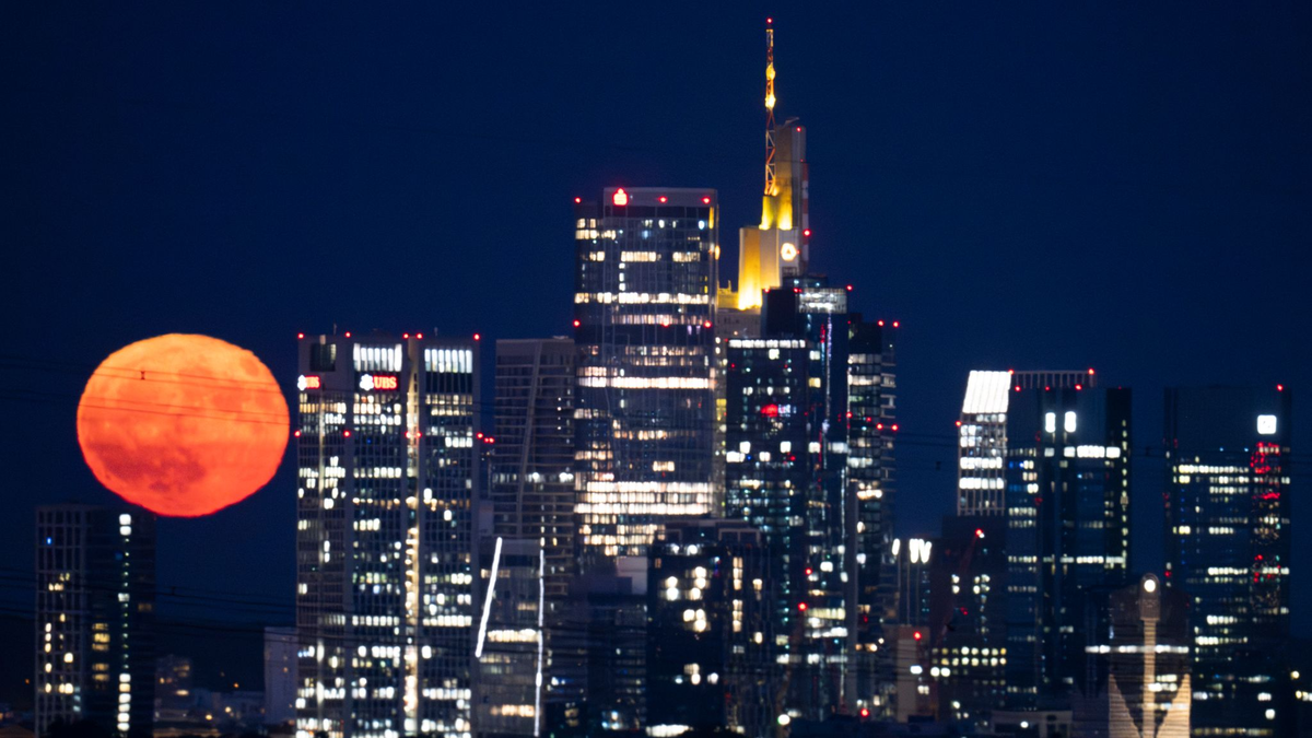In Frankfurt reihte sich der Erdbeermond in die Skyline ein. - Foto: Boris Roessler/dpa