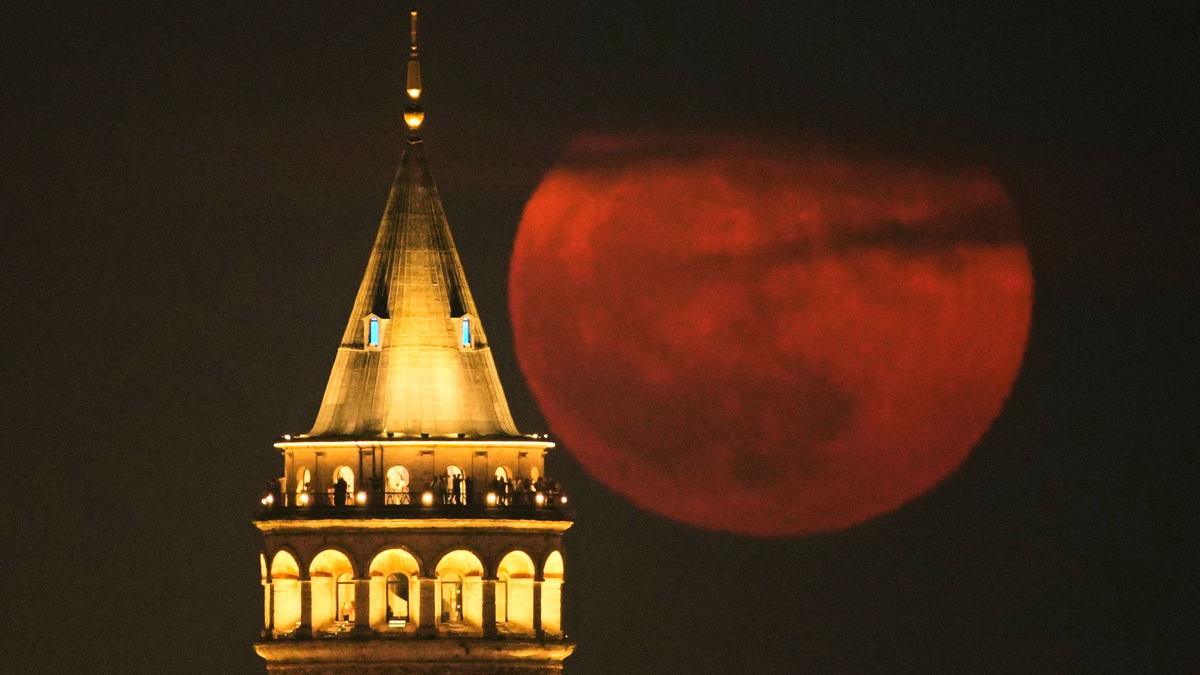 Der Erdbeermond geht hinter dem Galata-Turm in Istanbul auf. - Foto: Emrah Gurel/AP/dpa