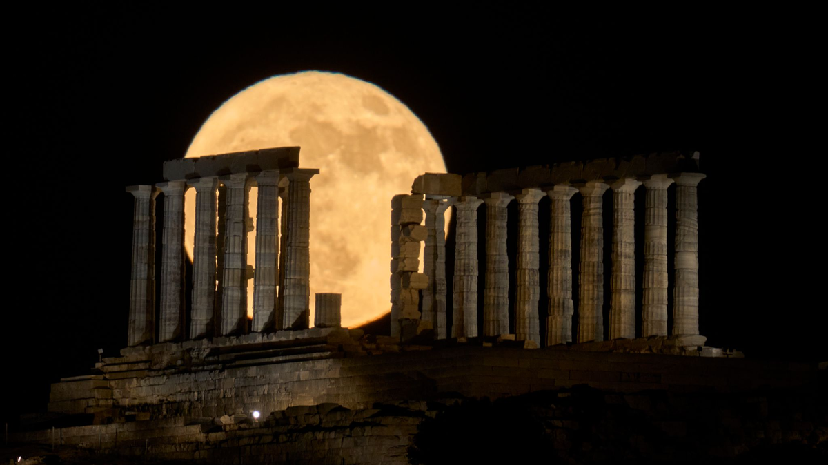 Der Erdbeermond geht in Griechenland hinter dem Poseidontempel am Kap Sounion auf. - Foto: Petros Giannakouris/AP/dpa