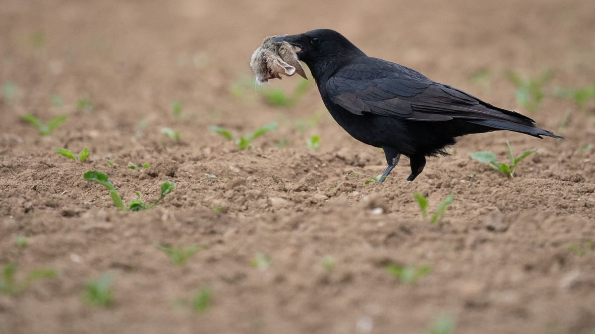 • FĂĽchse und Waschbären zählen zu den wichtigsten Fressfeinden der MĂĽmmler. Auf diesem Foto hatte ein Langohr gegen eine Krähe das Nachsehen. (Symbolbild) - Foto: Sebastian Gollnow/dpa