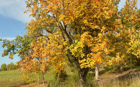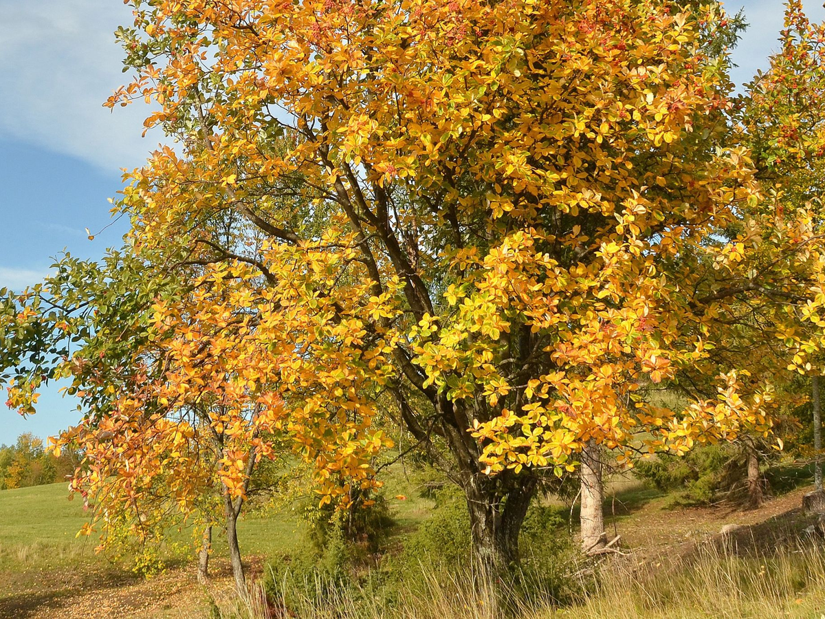 Jetzt im Herbst ist die Mehlbeere (Sorbus aria) nach Stiftungsangaben besonders schön anzusehen: Die orangefarbenen bis scharlachroten Früchte schienen dann durch die gelb bis goldbraune Laubkrone. Sie schmecken mehlig und eher langweilig, wie die Stiftung auf Anfrage erklärte. Ob der Name der Baumart daher rührt, sei nicht eindeutig belegt. Es könne auch sein, dass dabei die bemehlt aussehenden jungen Triebe und Blattunterseiten eine Rolle spielten, ebenso wie die Nutzung getrockneter Mehlbeerenfrüchte zur Streckung von Mehl in Notzeiten.