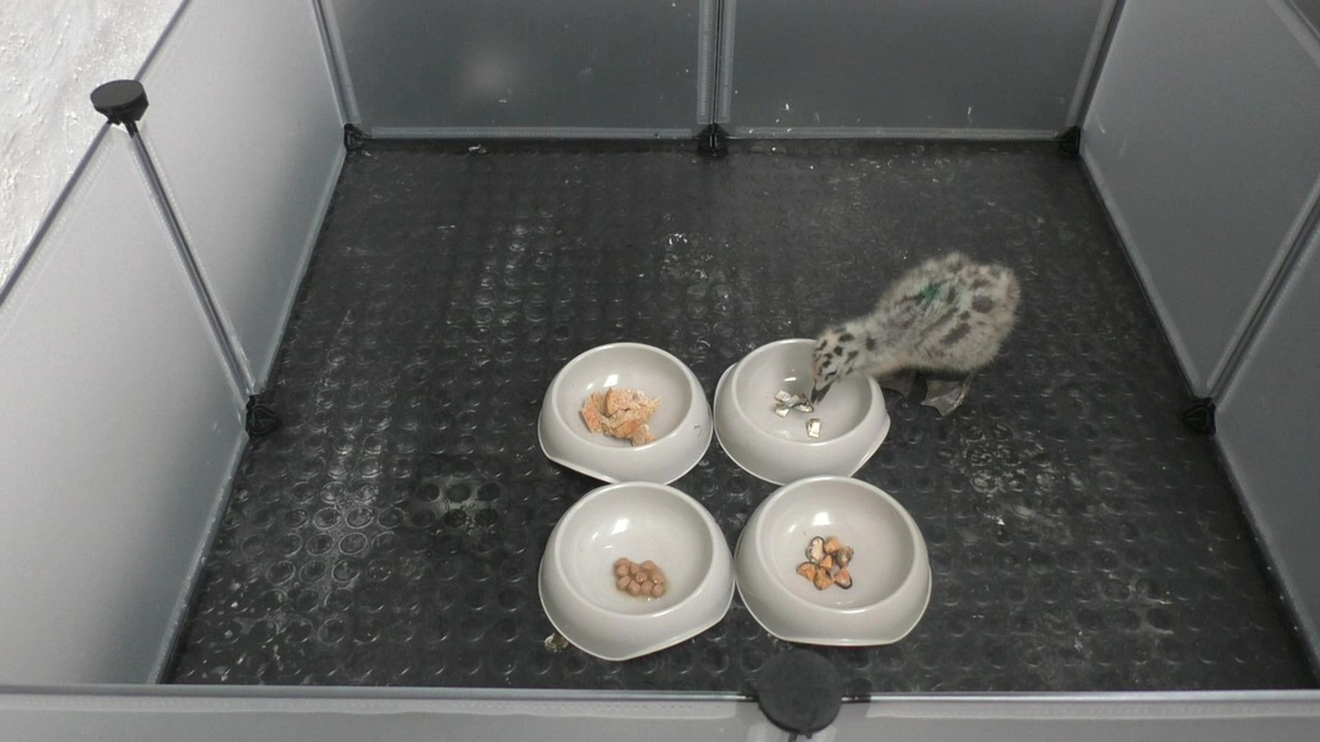 An Tag 5, 10, 15 und 35 hatten alle Küken die Wahl: Sie konnten sich aussuchen, aus welchem von vier Schälchen sie ihr Futter pickten. Die meisten kleinen Seemöwen entschieden sich für Fisch. Muscheln und Katzenfutter wurden ab und zu angerührt. Brot hingegen nahmen die Küken nur in den Schnabel, wenn alle anderen Schälchen leer waren.