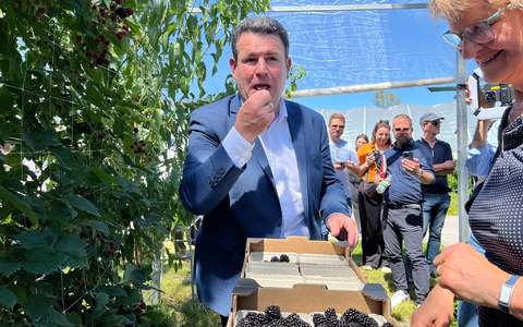Heil ließ sich vor Augen führen, was KI heute im Betrieb heißen kann - etwa auf einem Obstbaubetrieb in Baden, wo Hightech für Beschattung und Energie aus Solarmodulen zuständig ist. Das Max-Planck-Institut für Intelligente Systeme in Tübingen zeigte, auf was es bei der Entwicklung von Ernterobotern ankommt: Ein gelber Roboter, eine Art Riesenkäfer auf Metall, stakste noch ungelenk über ein Probefeld.